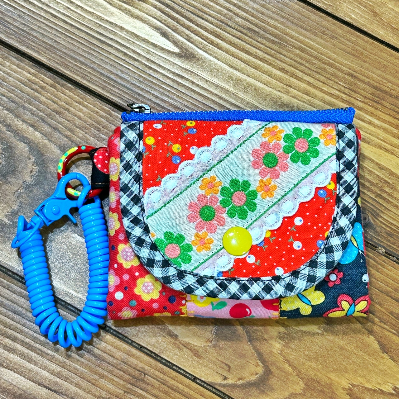レトロポップな柄をぎゅぎゅっと詰め込んだ、カラフルで楽しい小さなお財布です〜。