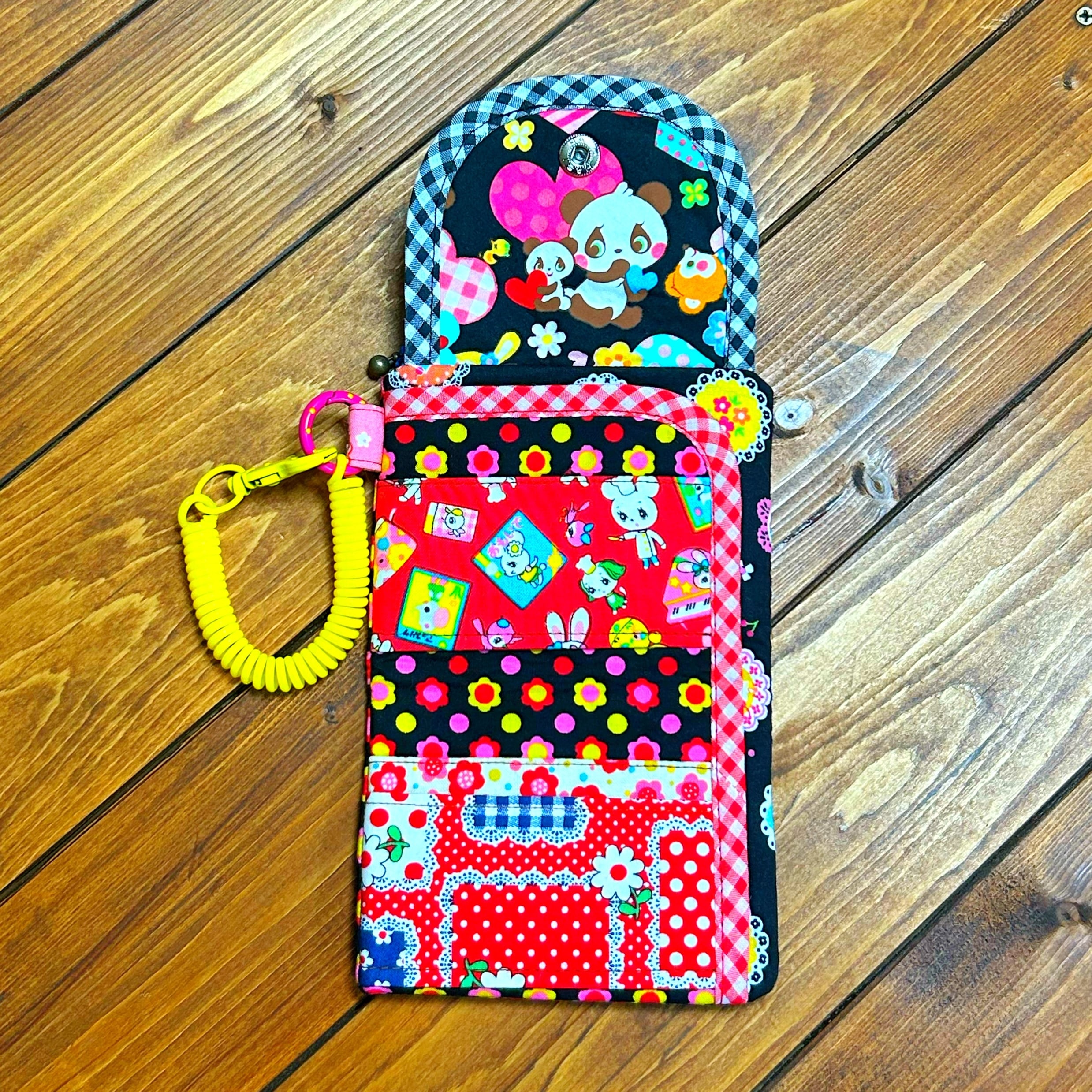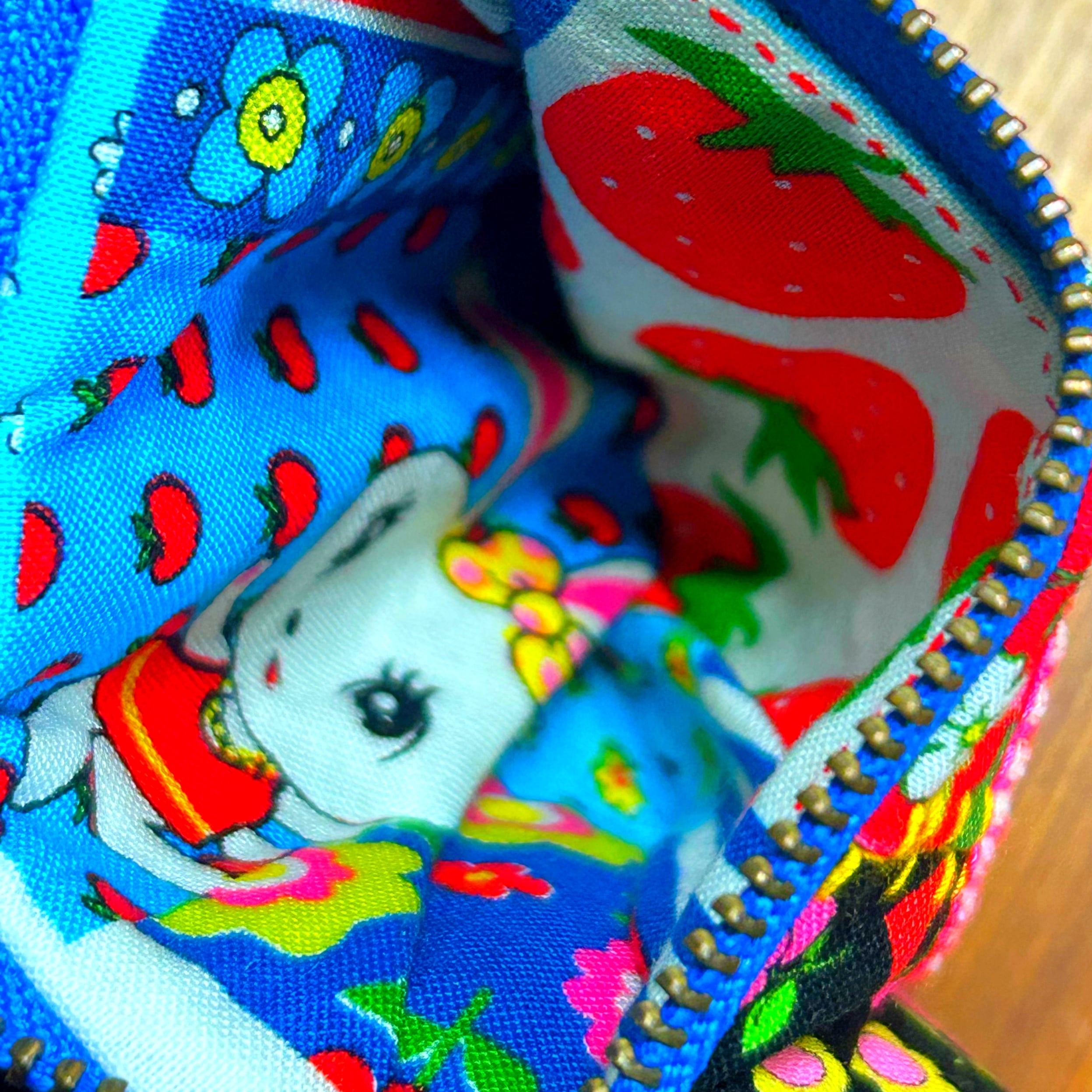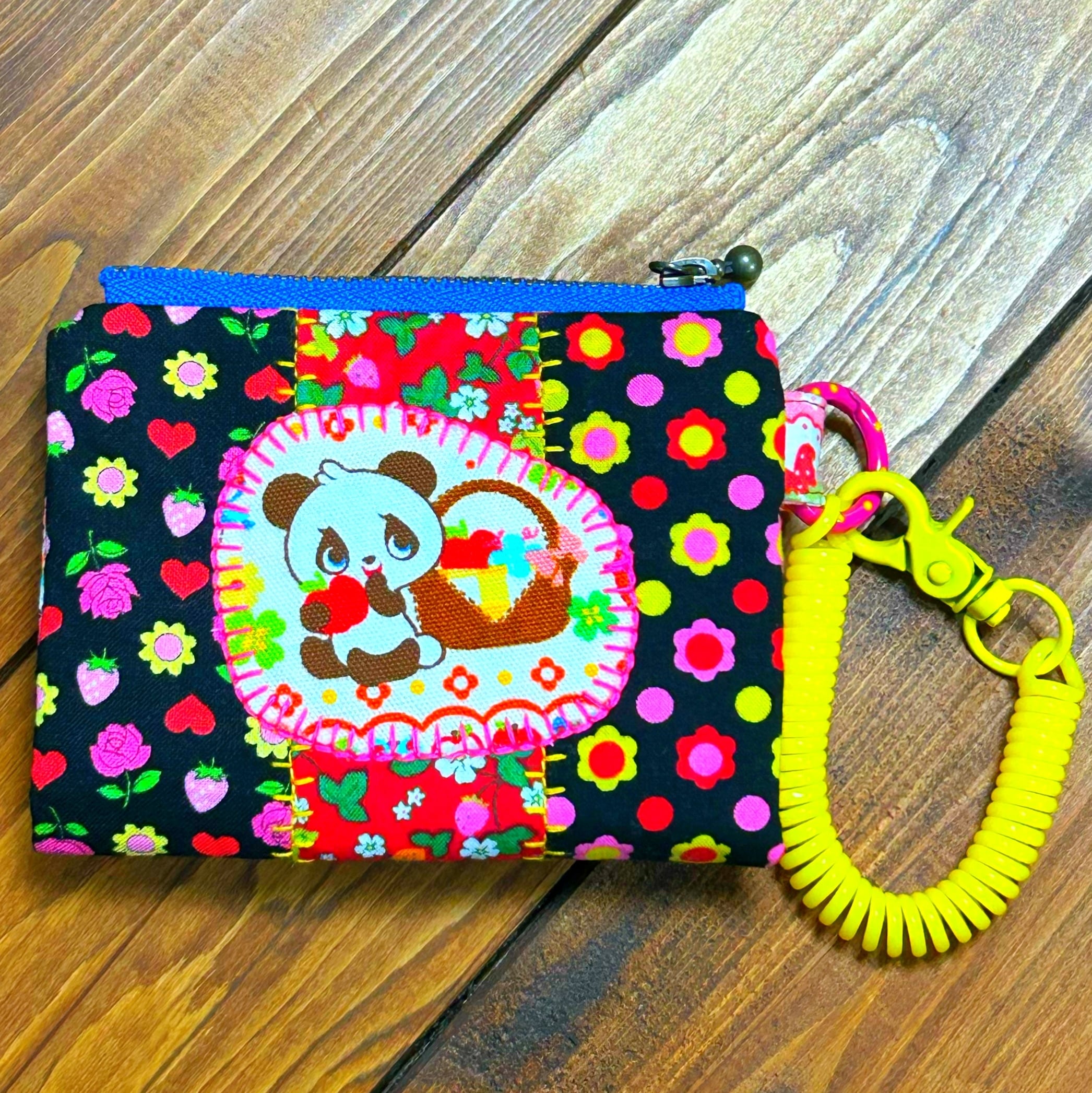 レトロポップな柄をぎゅぎゅっと詰め込んだ、カラフルで楽しい小さなお財布です〜。