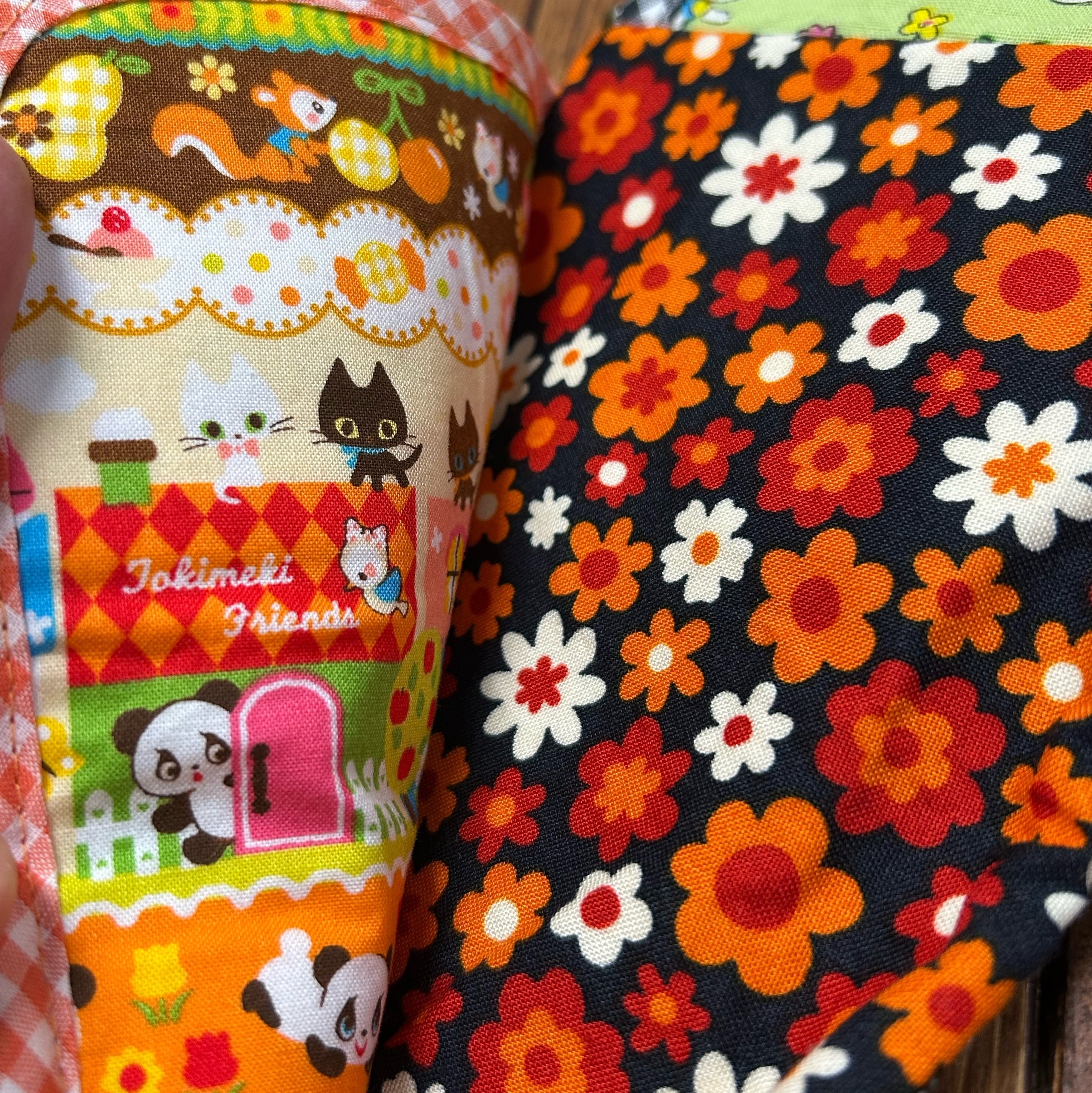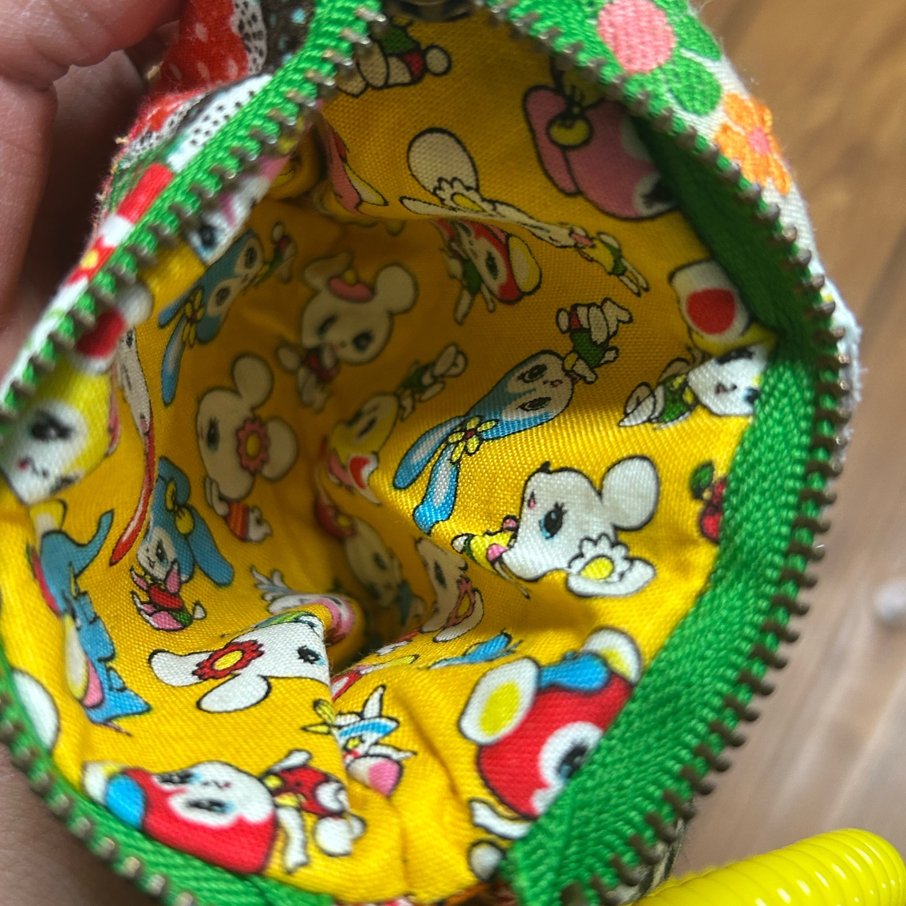 レトロポップな柄をぎゅぎゅっと詰め込んだ、カラフルで楽しい小さなお財布です〜。