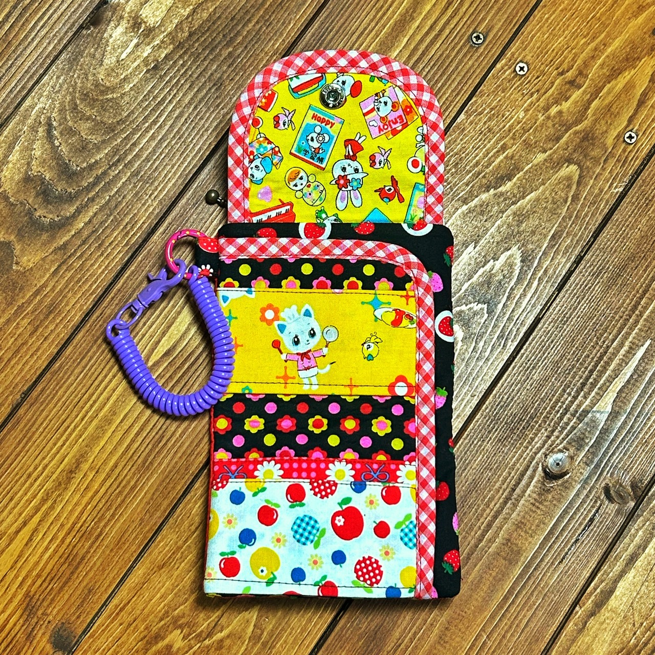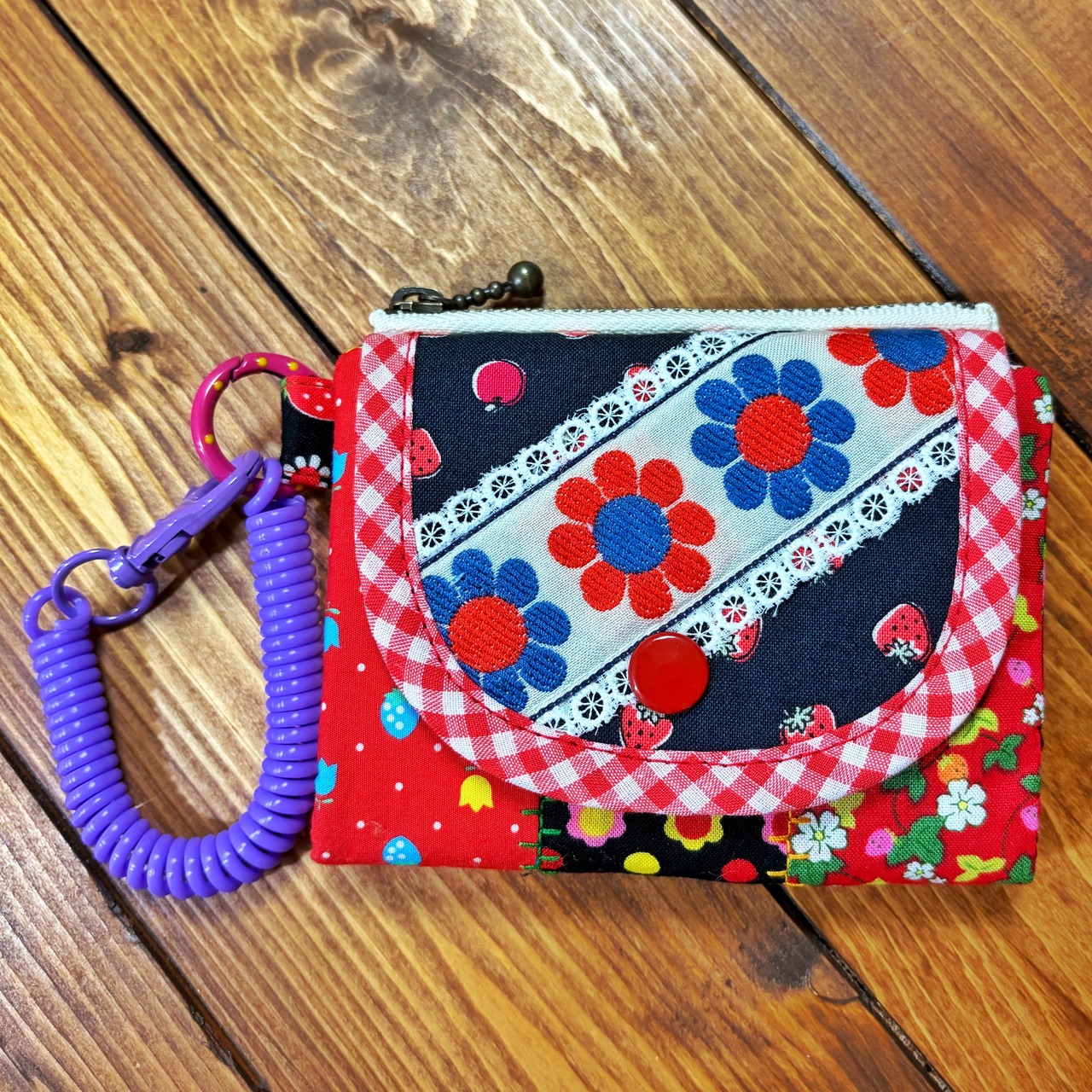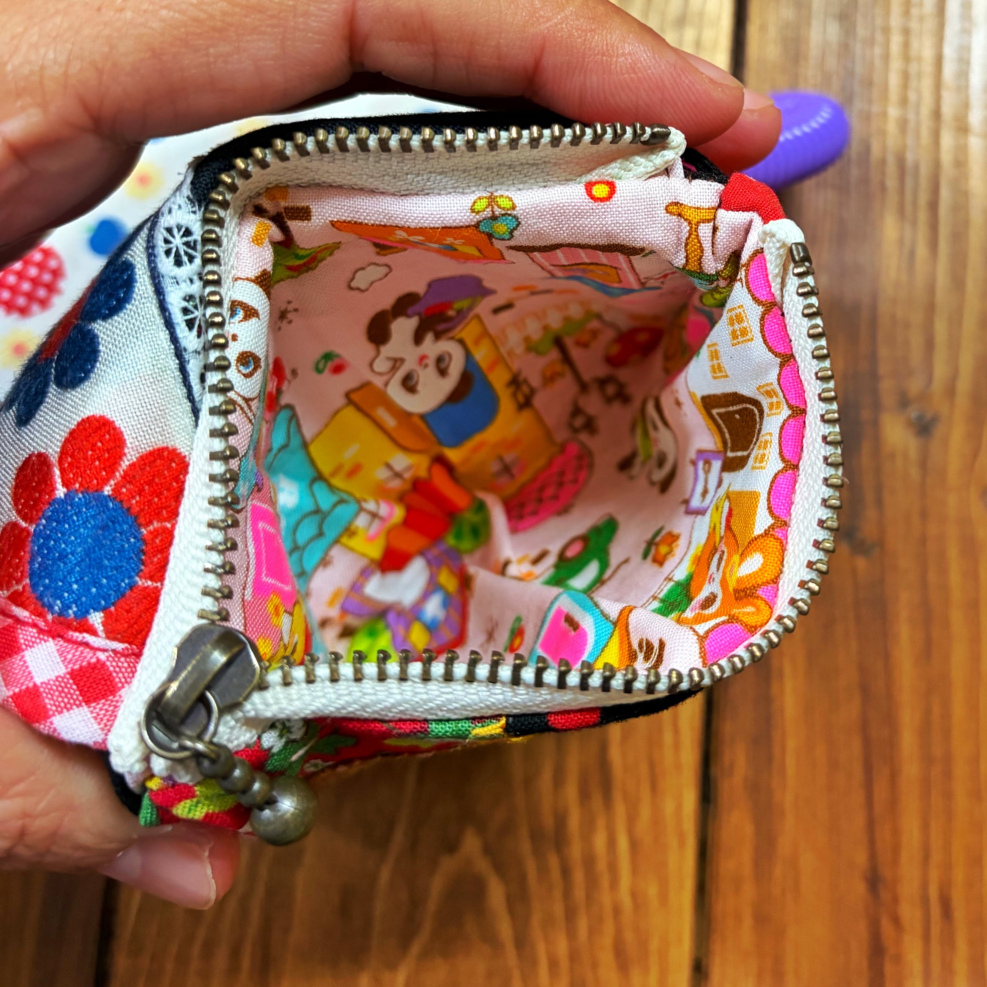 レトロポップな柄をぎゅぎゅっと詰め込んだ、カラフルで楽しい小さなお財布です〜。