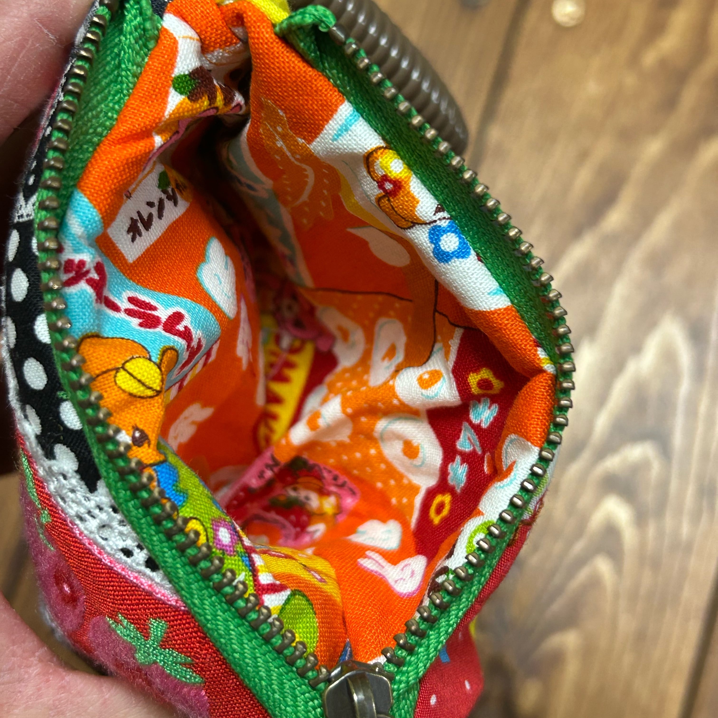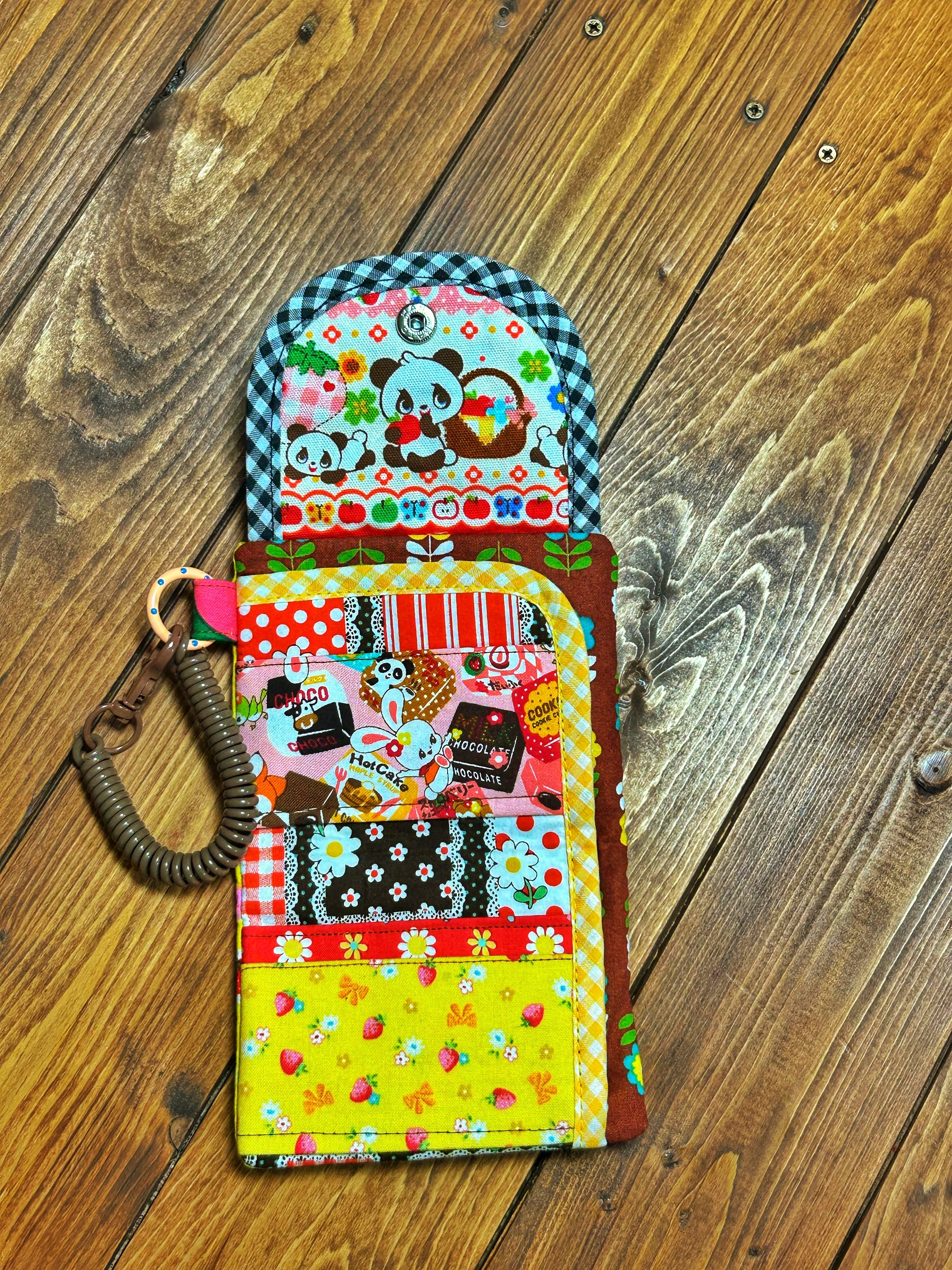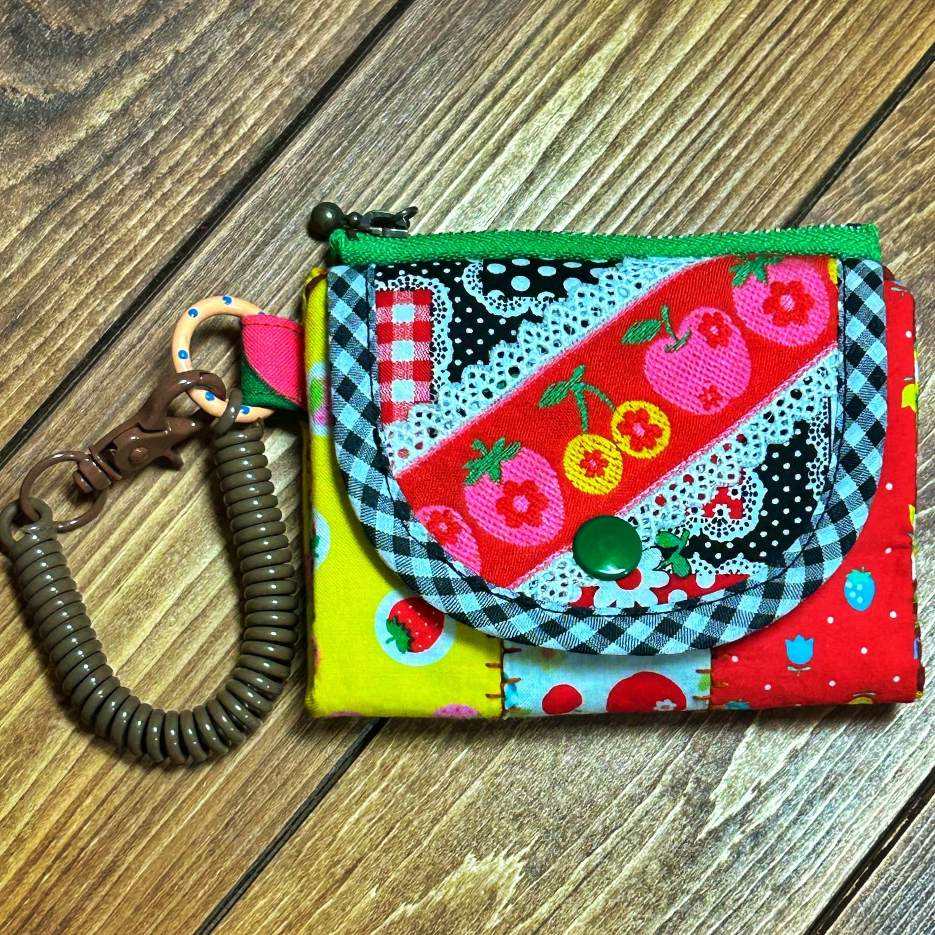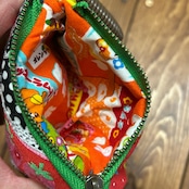 レトロポップな柄をぎゅぎゅっと詰め込んだ、カラフルで楽しい小さなお財布です〜。