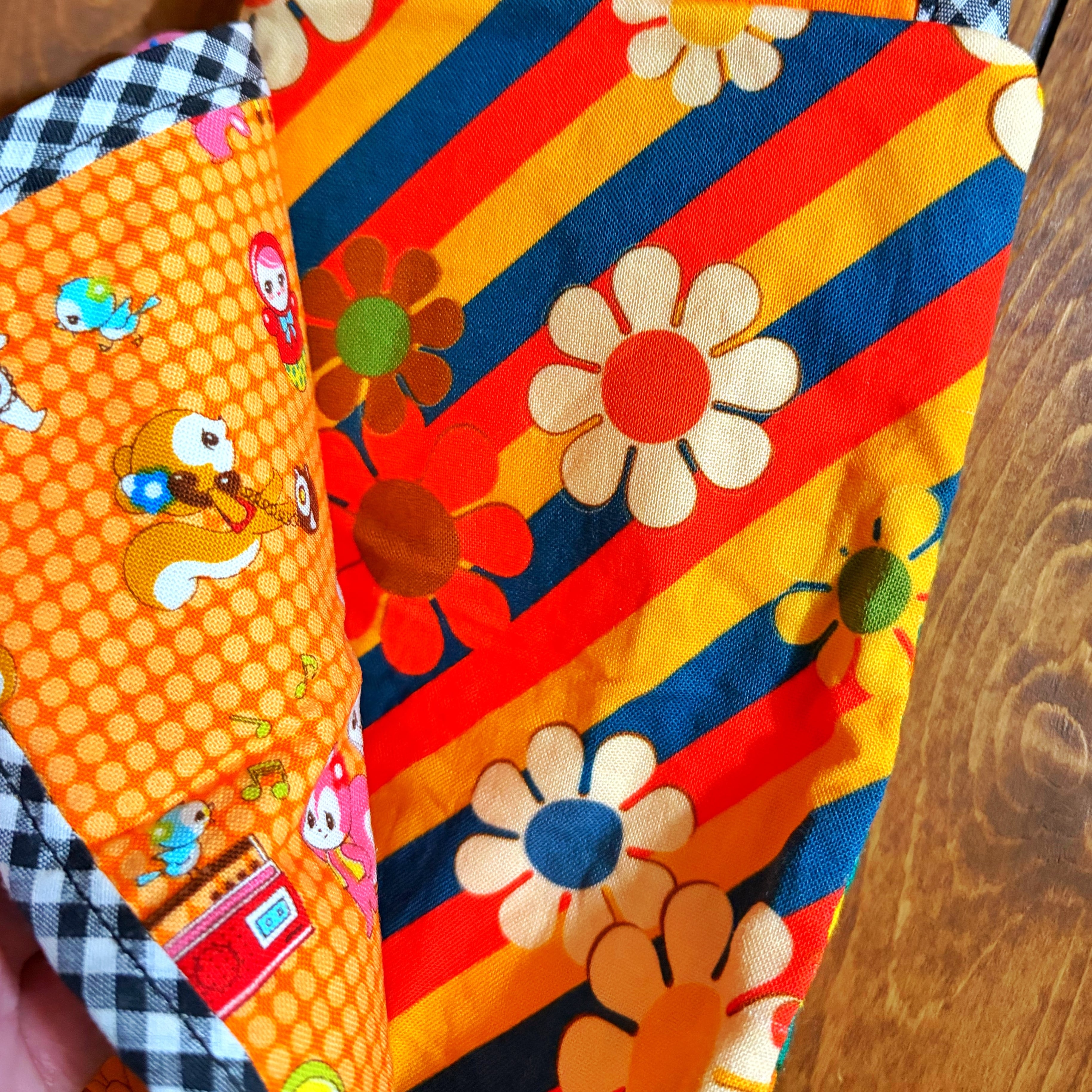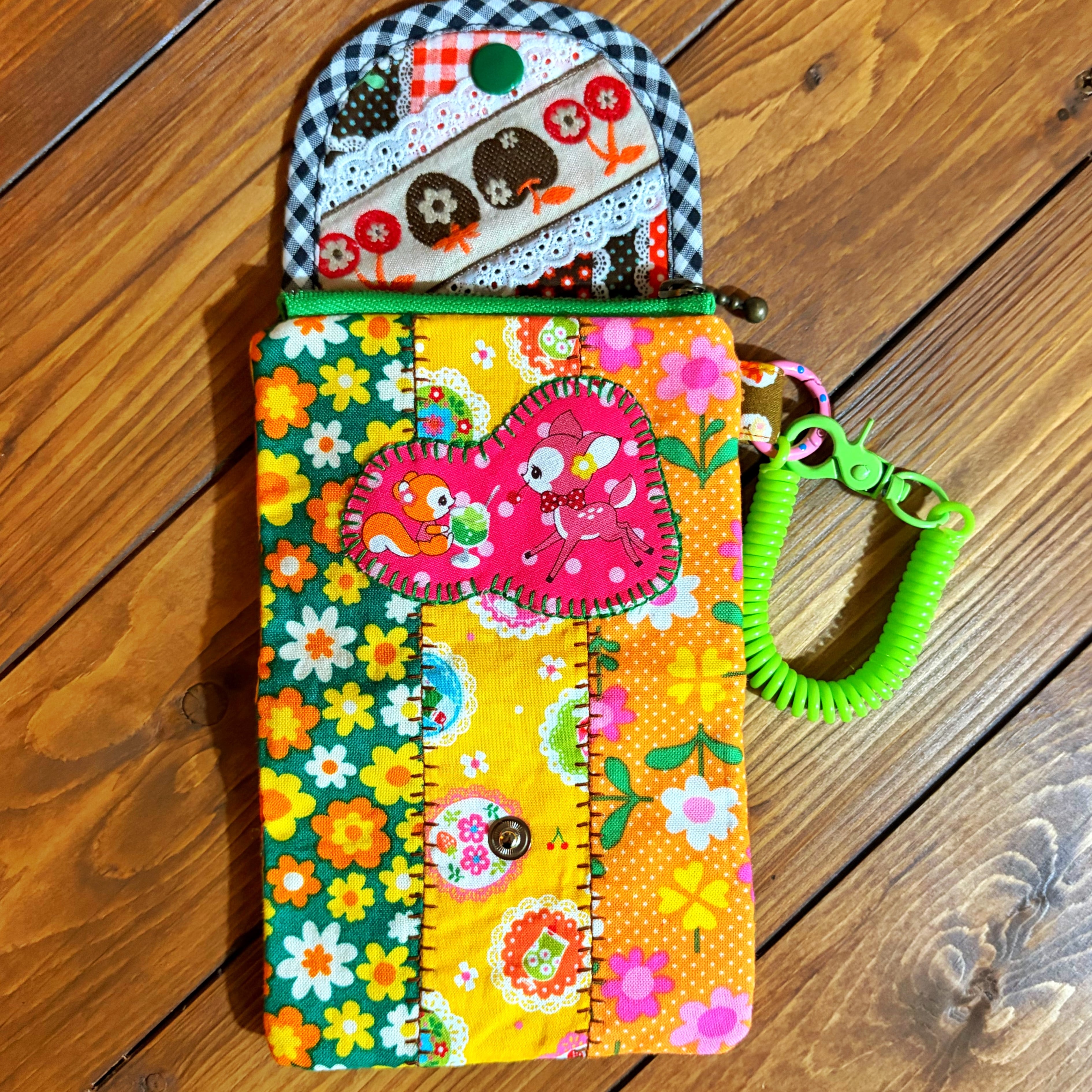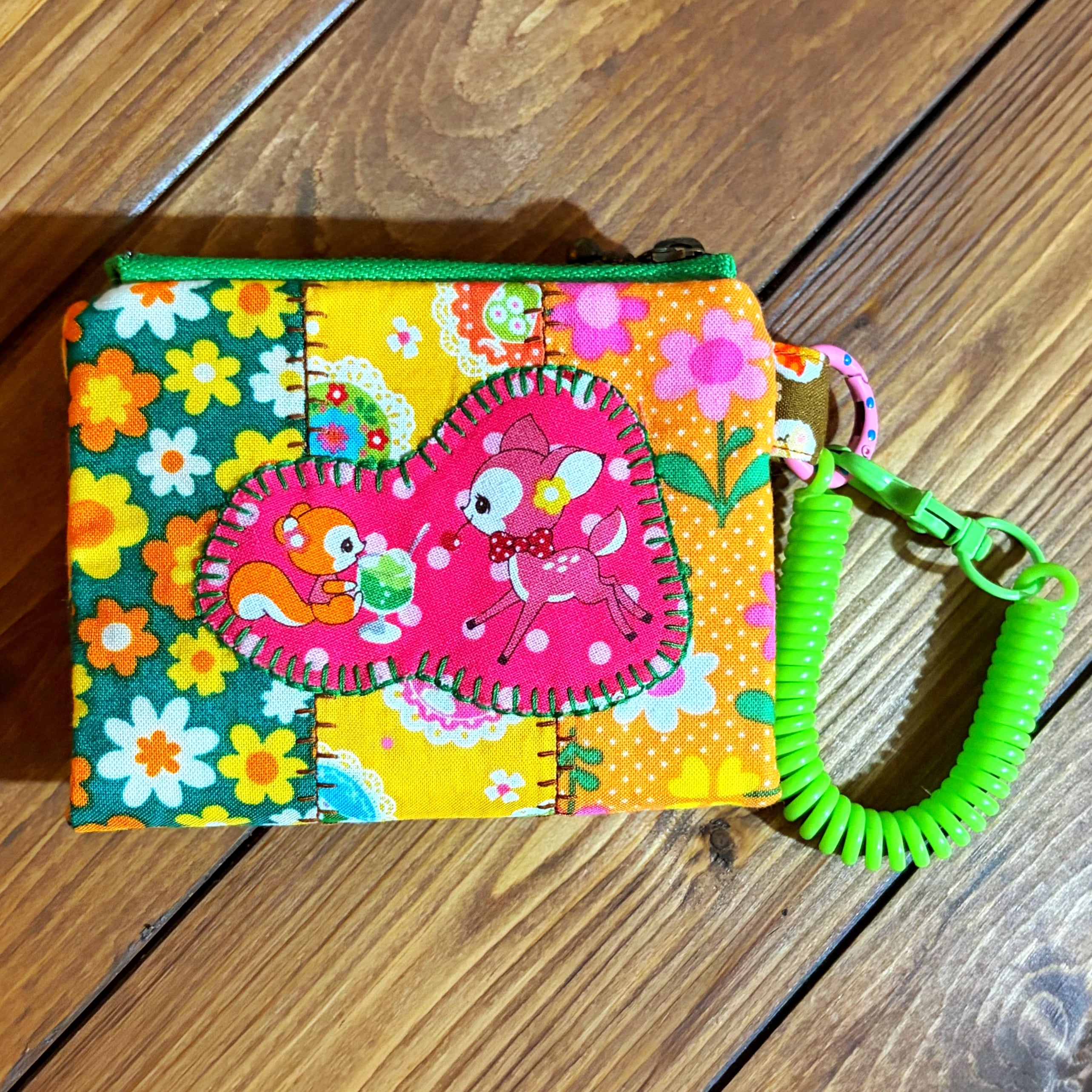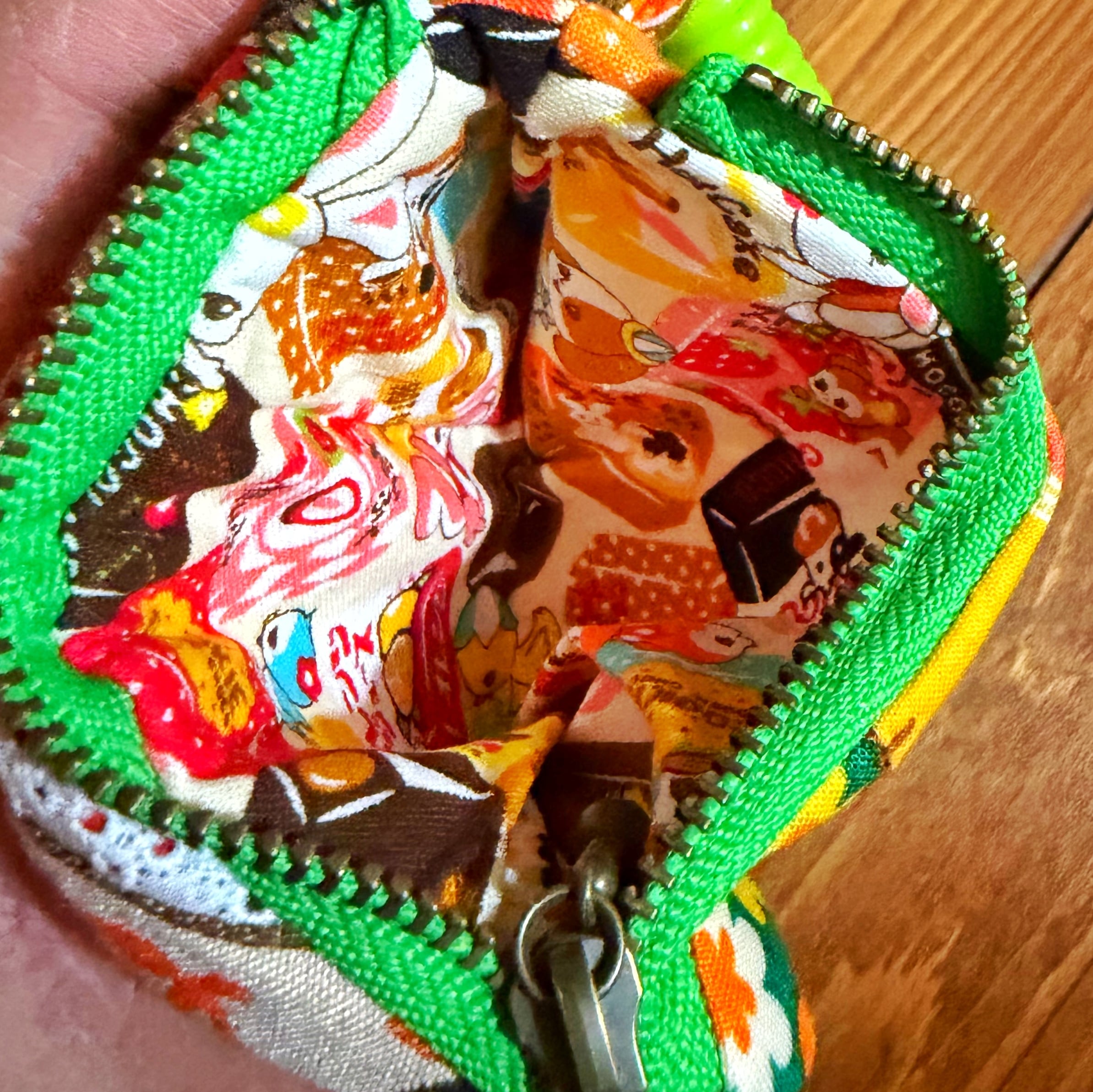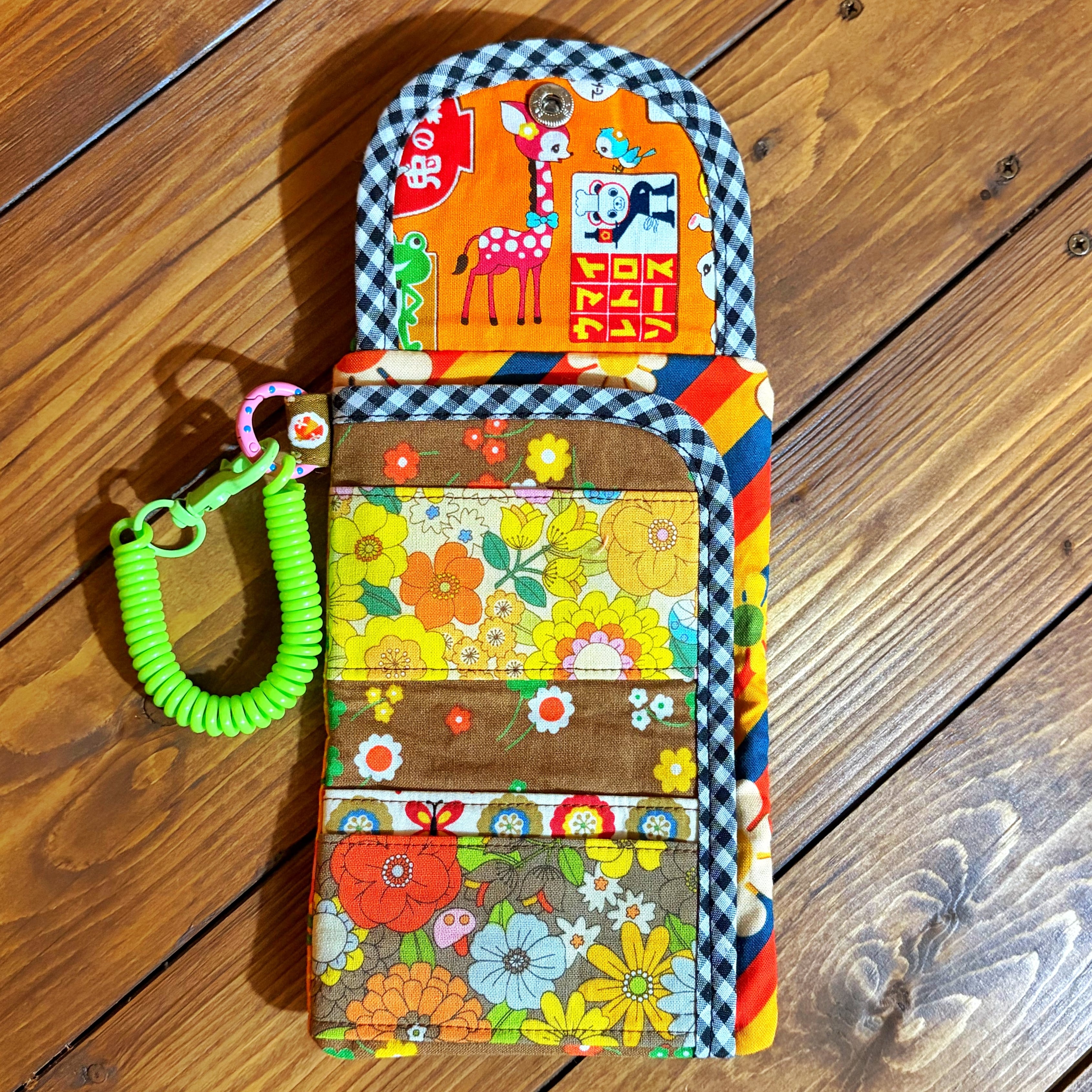 レトロポップな柄をぎゅぎゅっと詰め込んだ、カラフルで楽しい小さなお財布です〜。