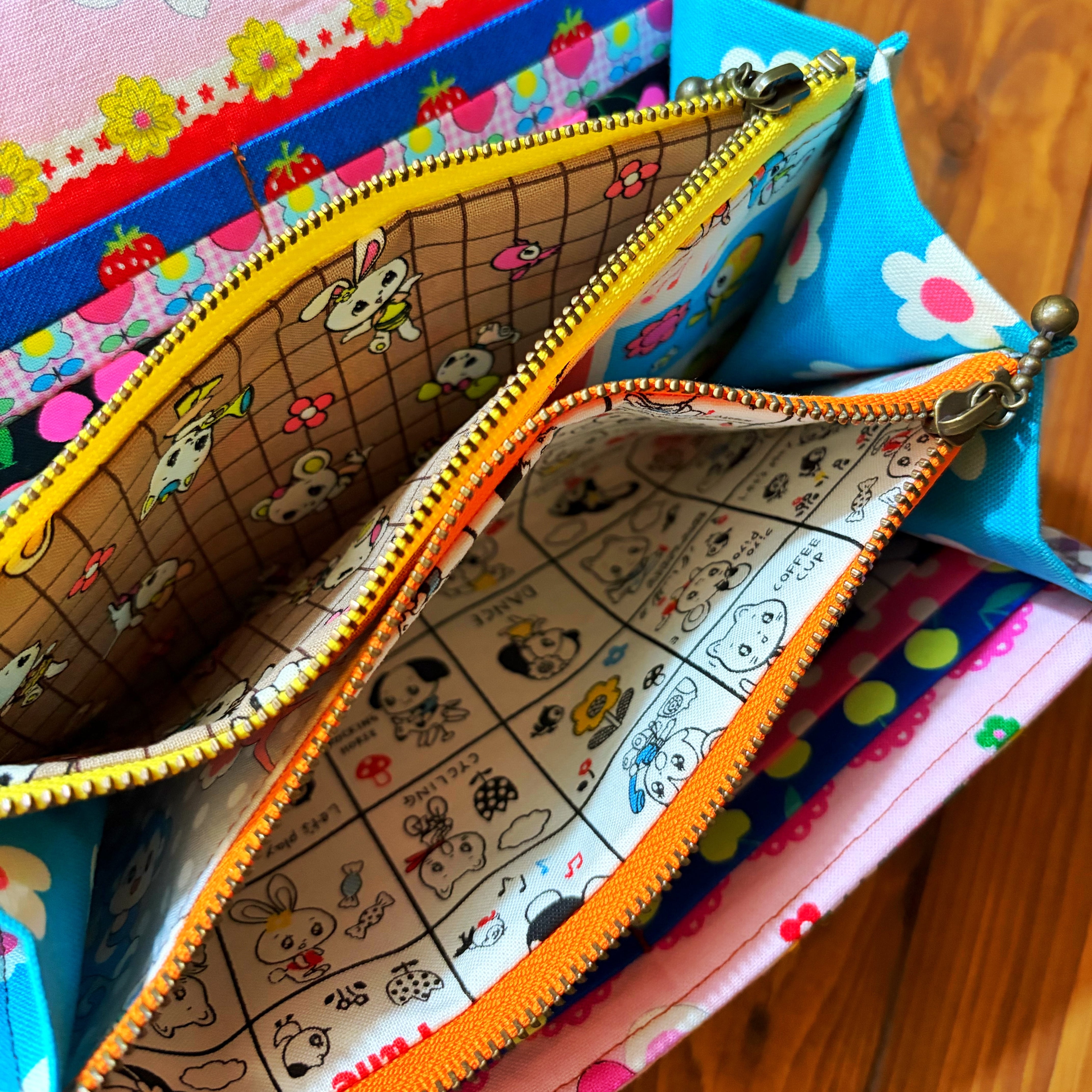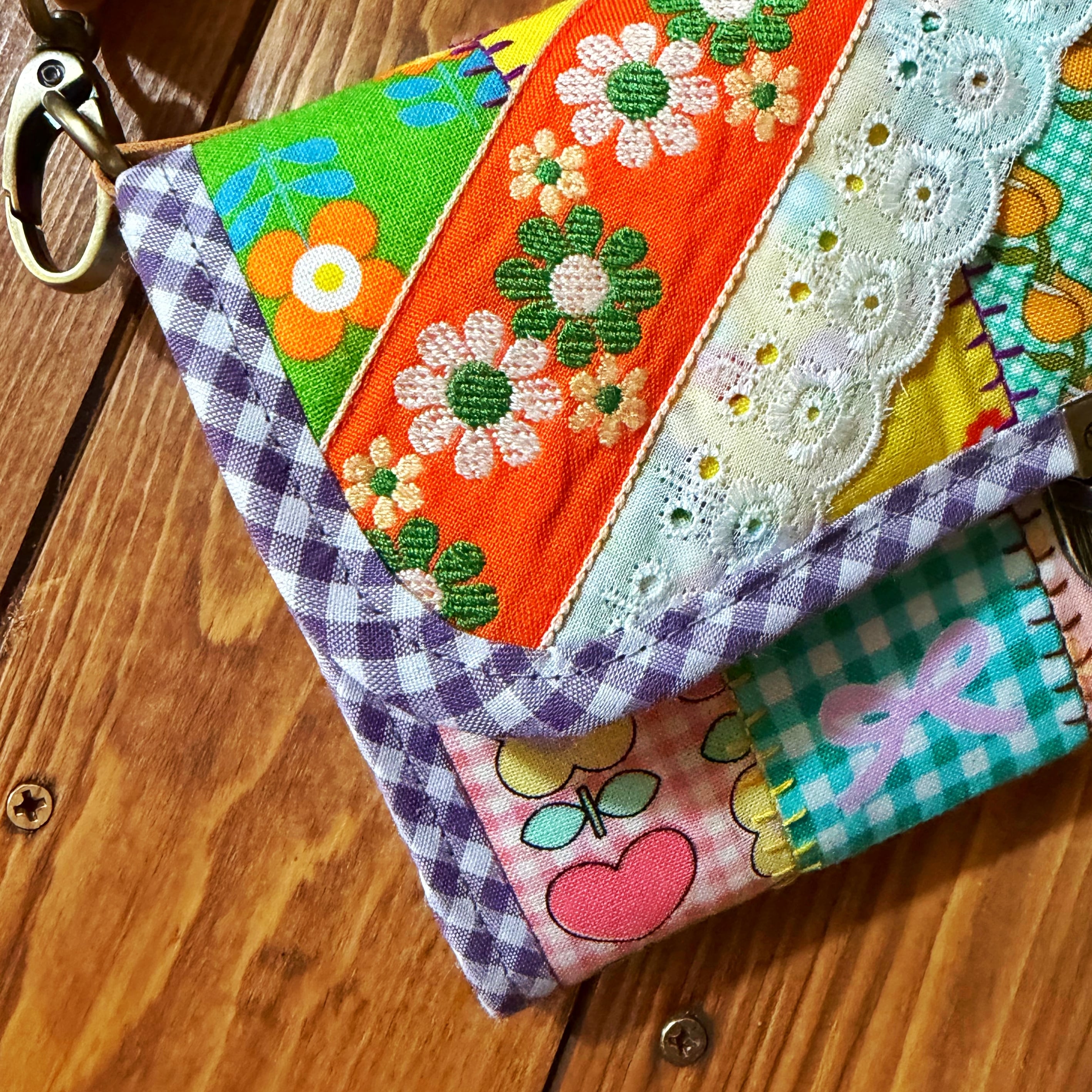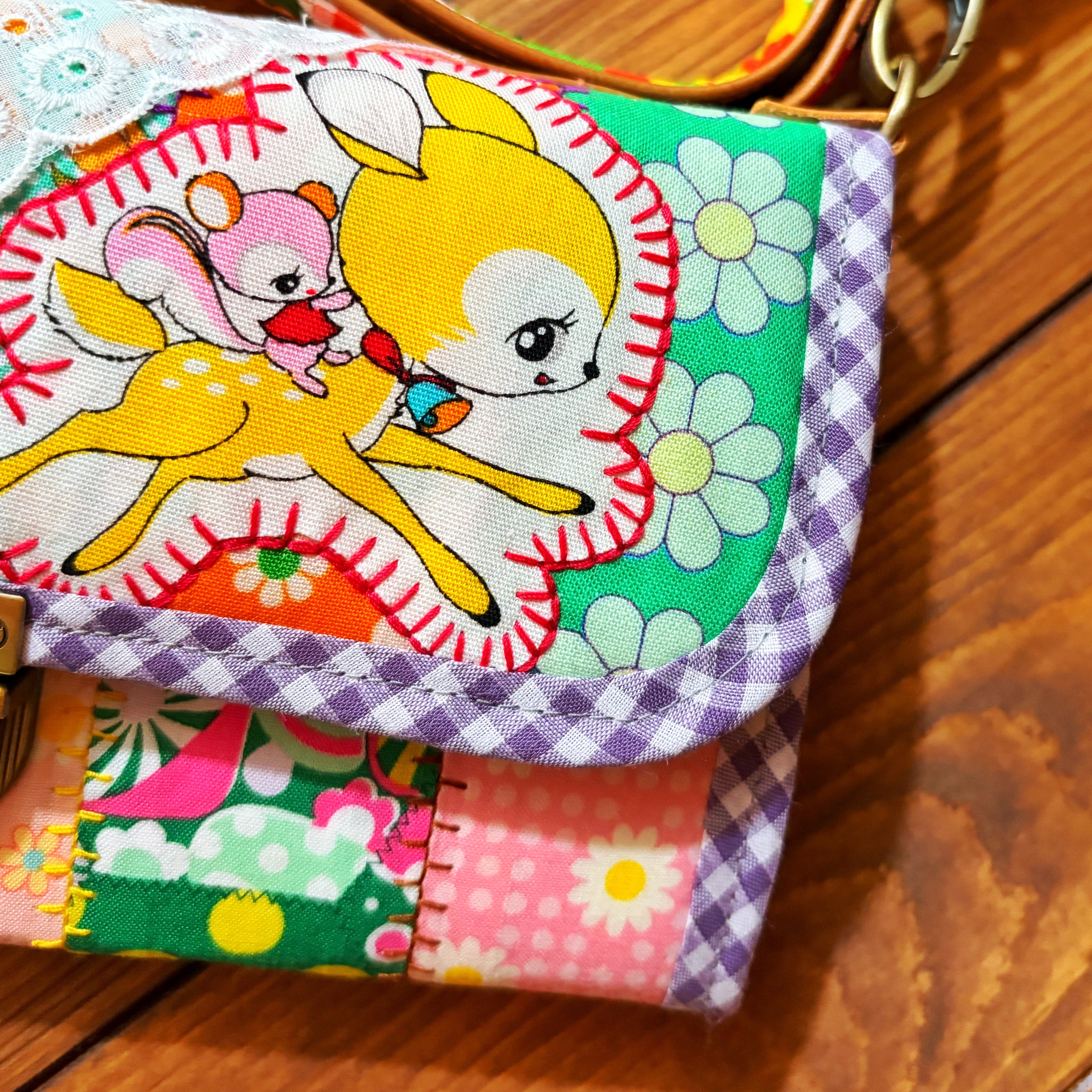 パッチワーク仕立てショルダー紐付きやりくり長財布。