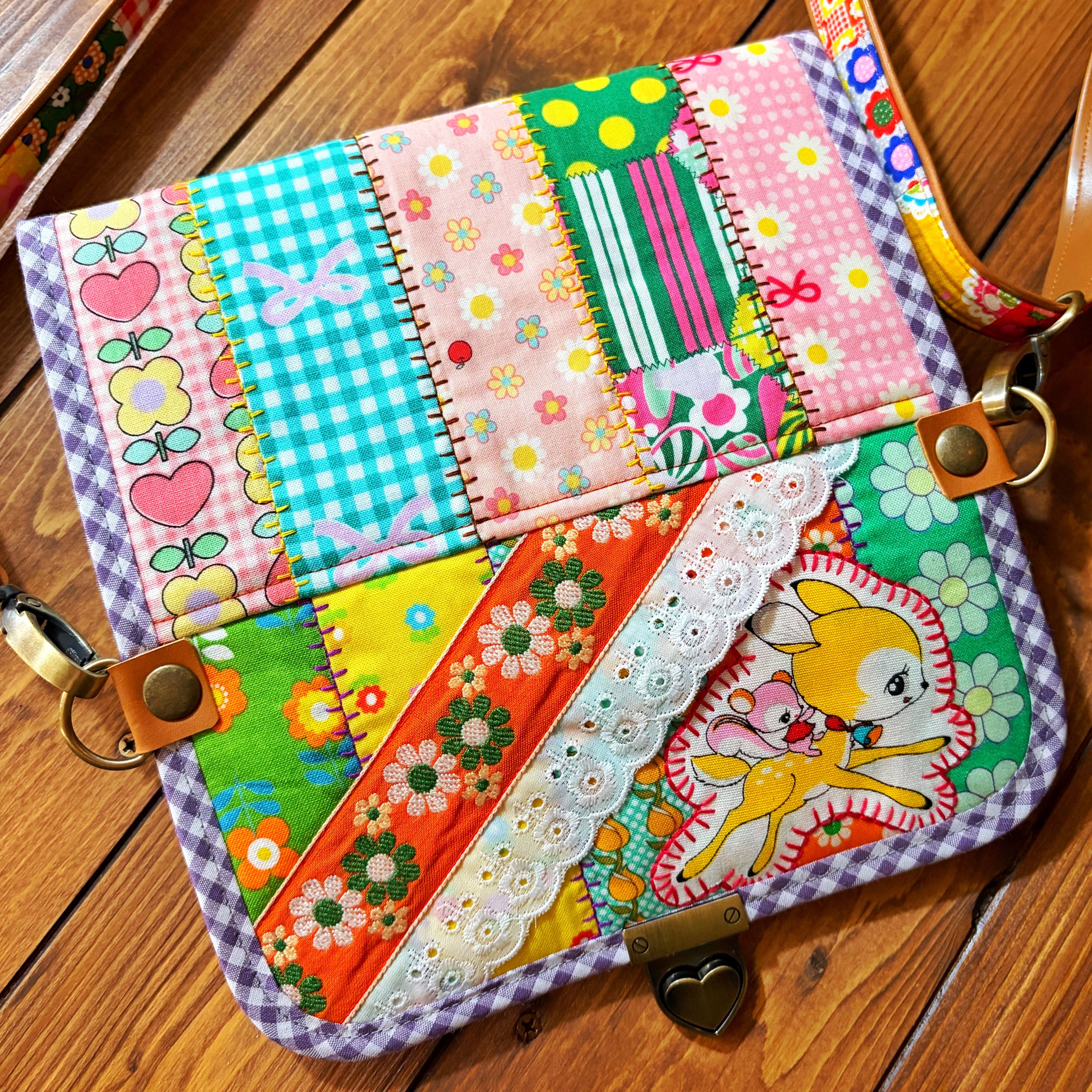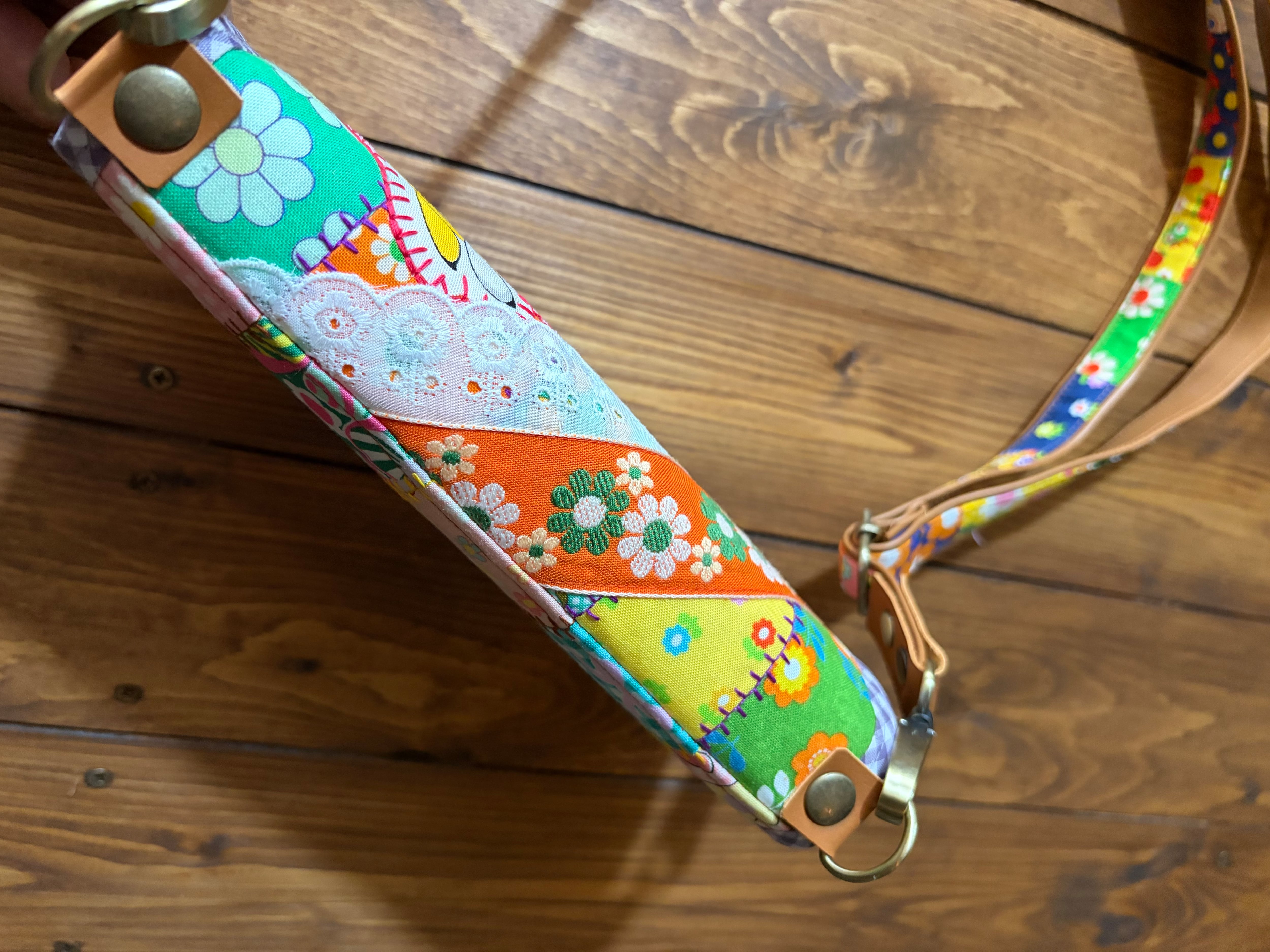 一つひとつ丁寧に組み合わせたパッチワーク仕立てに、同じ配置ではもう作れない、一点ものです。
