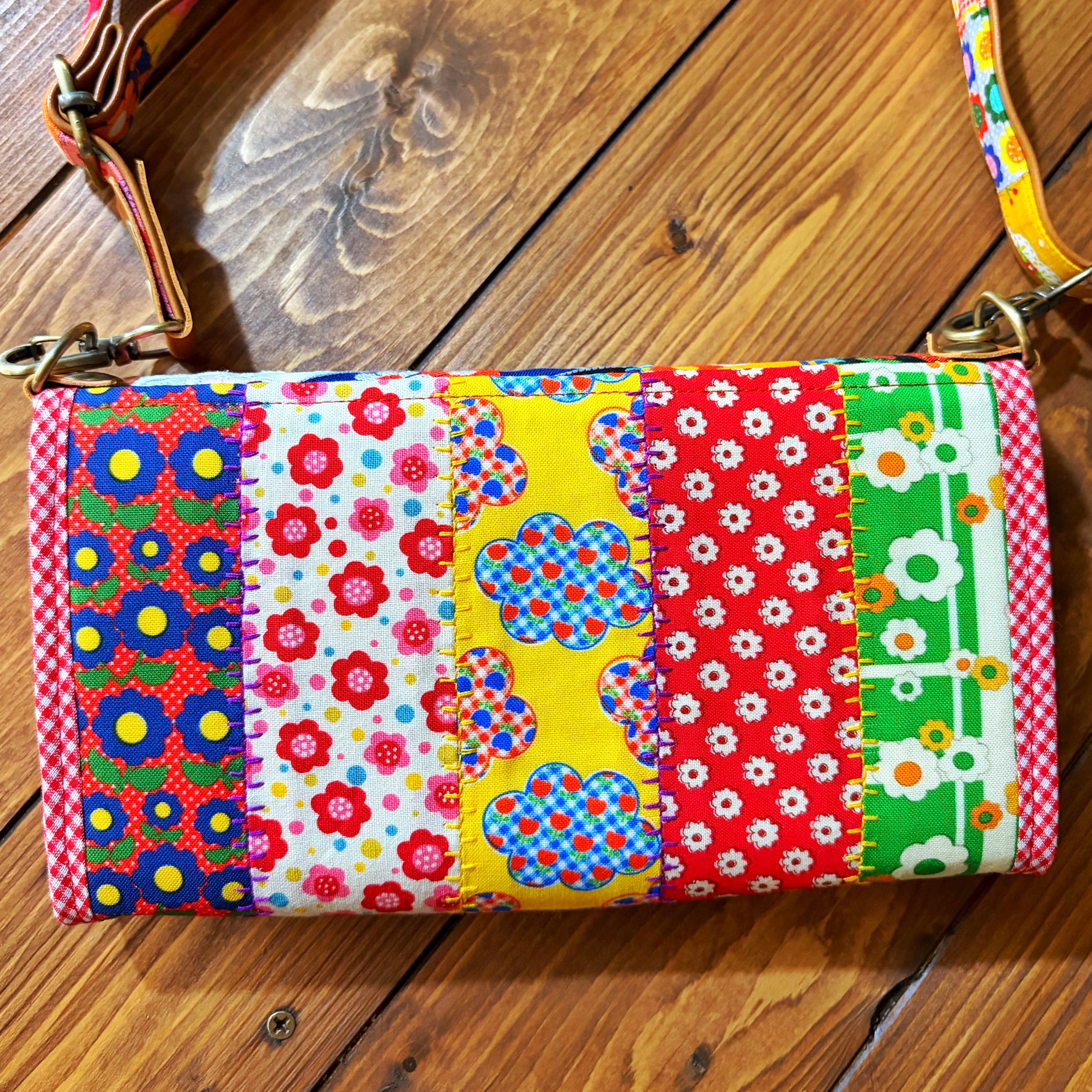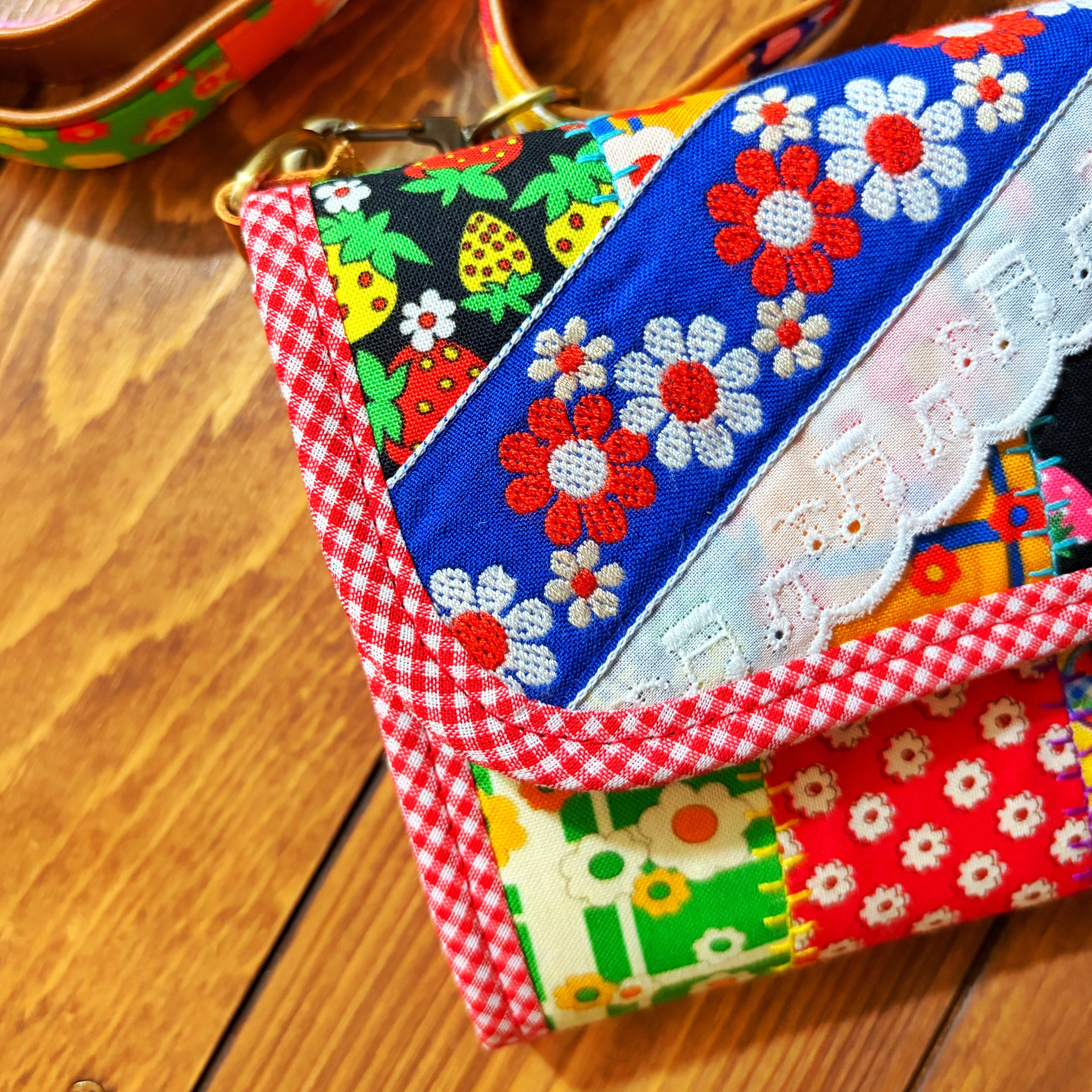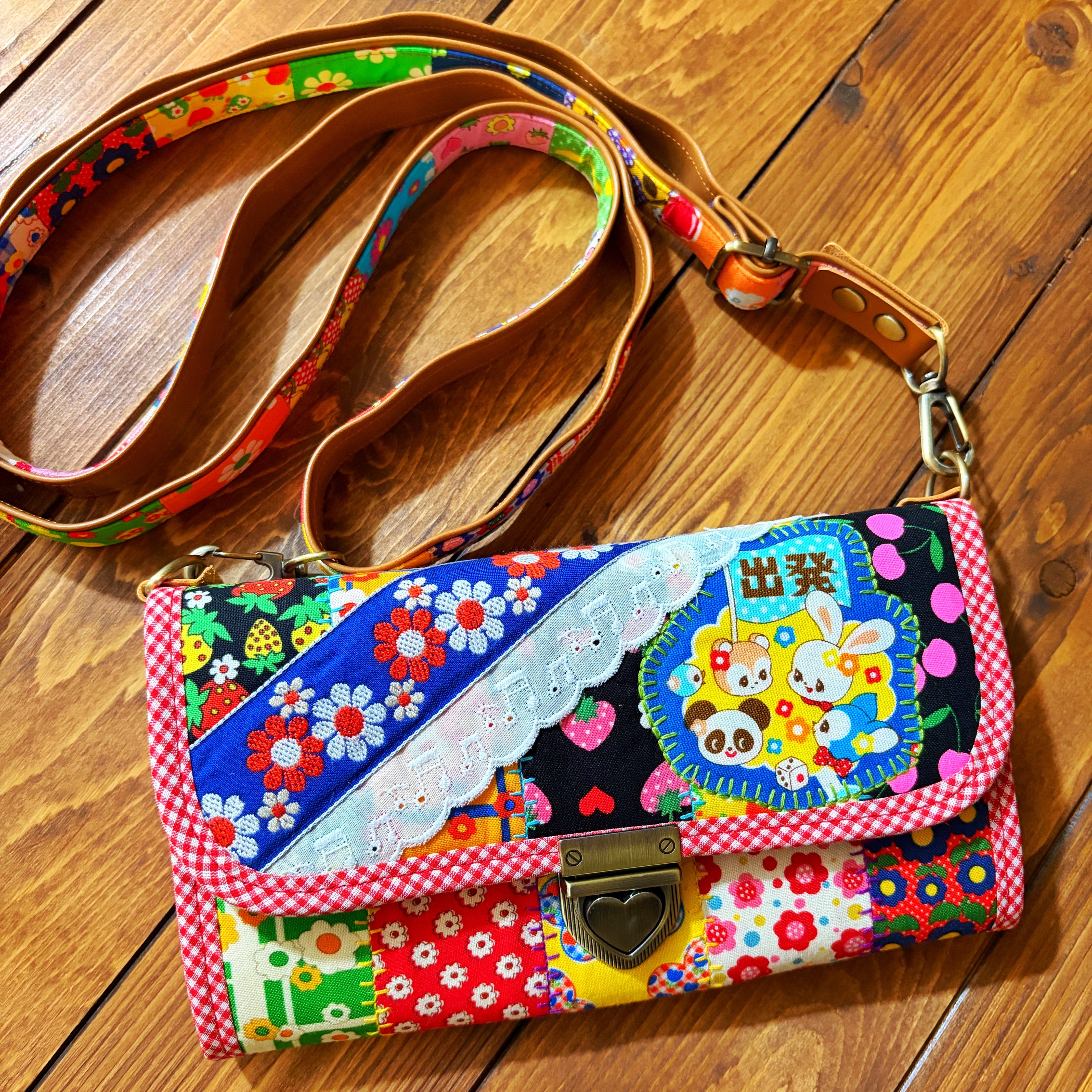 パッチワーク仕立てのショルダー紐付きやりくり長財布。
