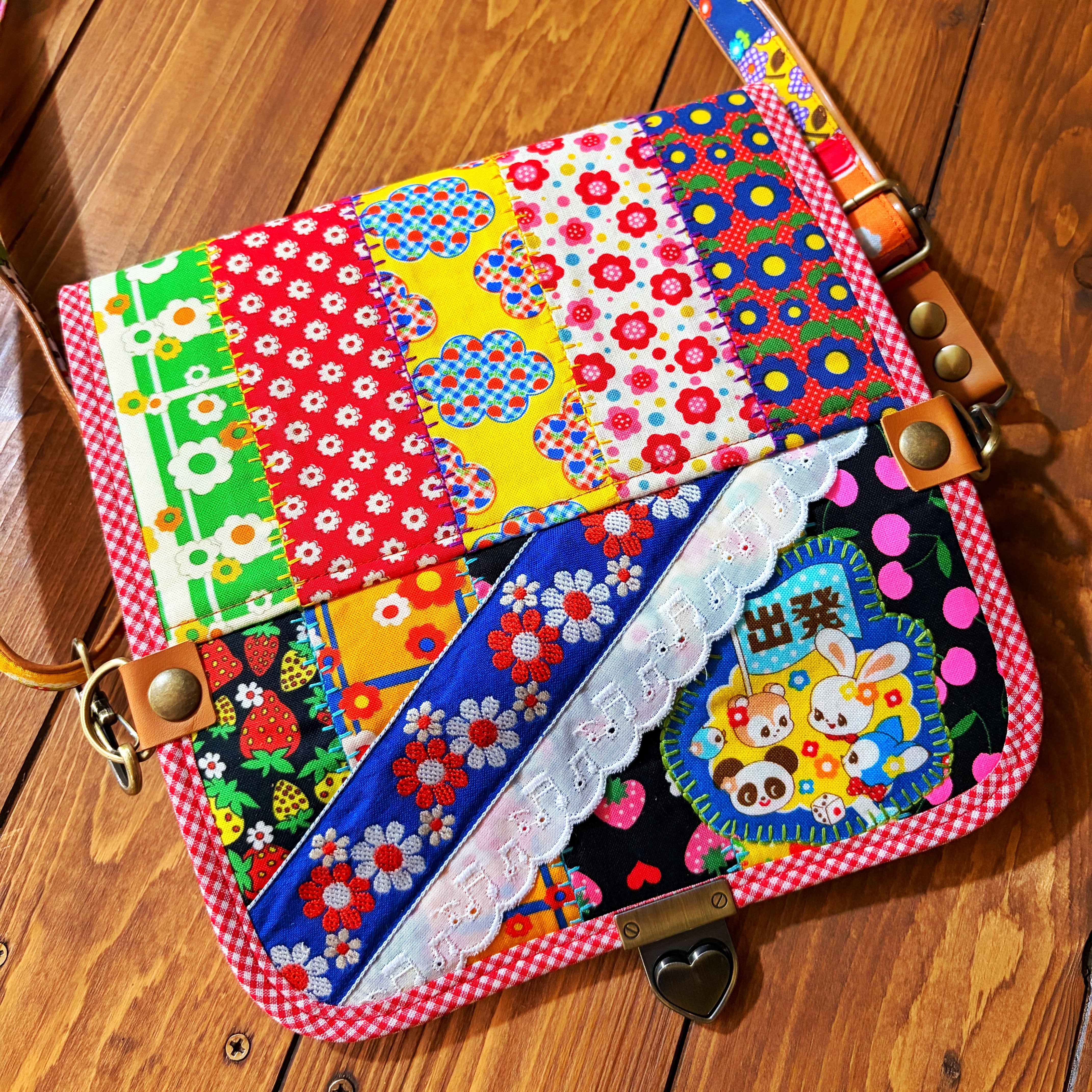 一つひとつ丁寧に組み合わせたパッチワーク仕立てに、同じ配置ではもう作れない、一点ものです。