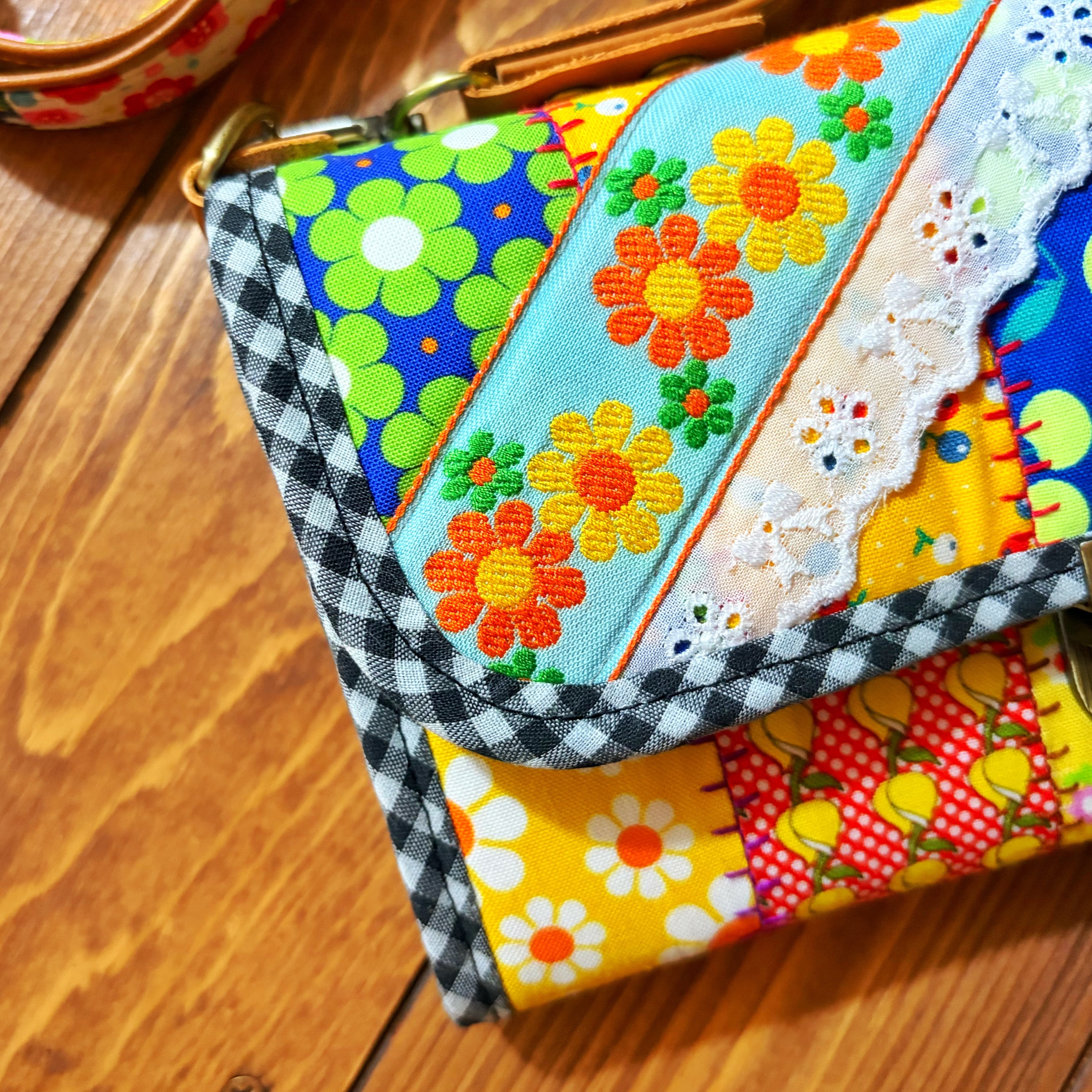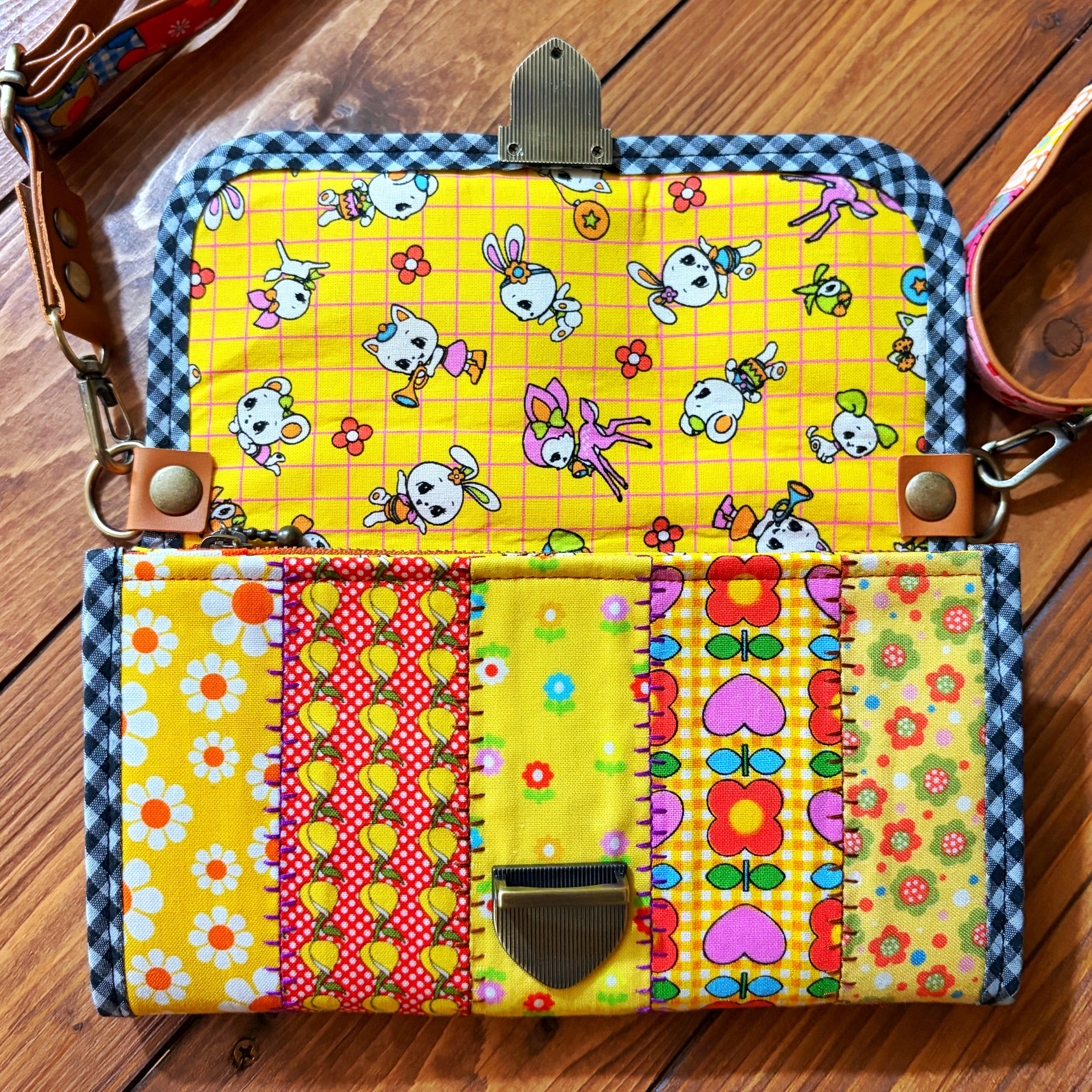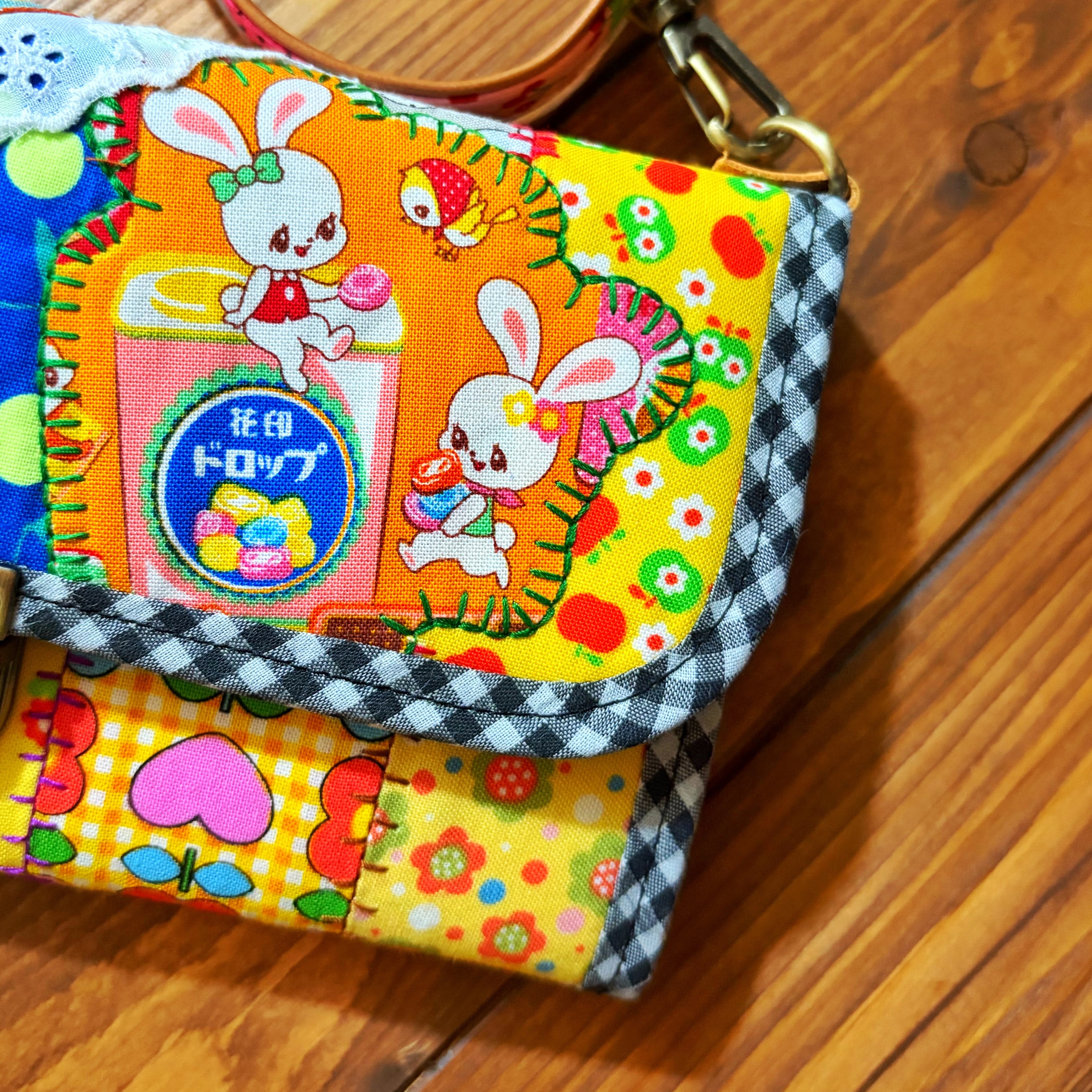パッチワーク仕立てのショルダー紐付きやりくり長財布。