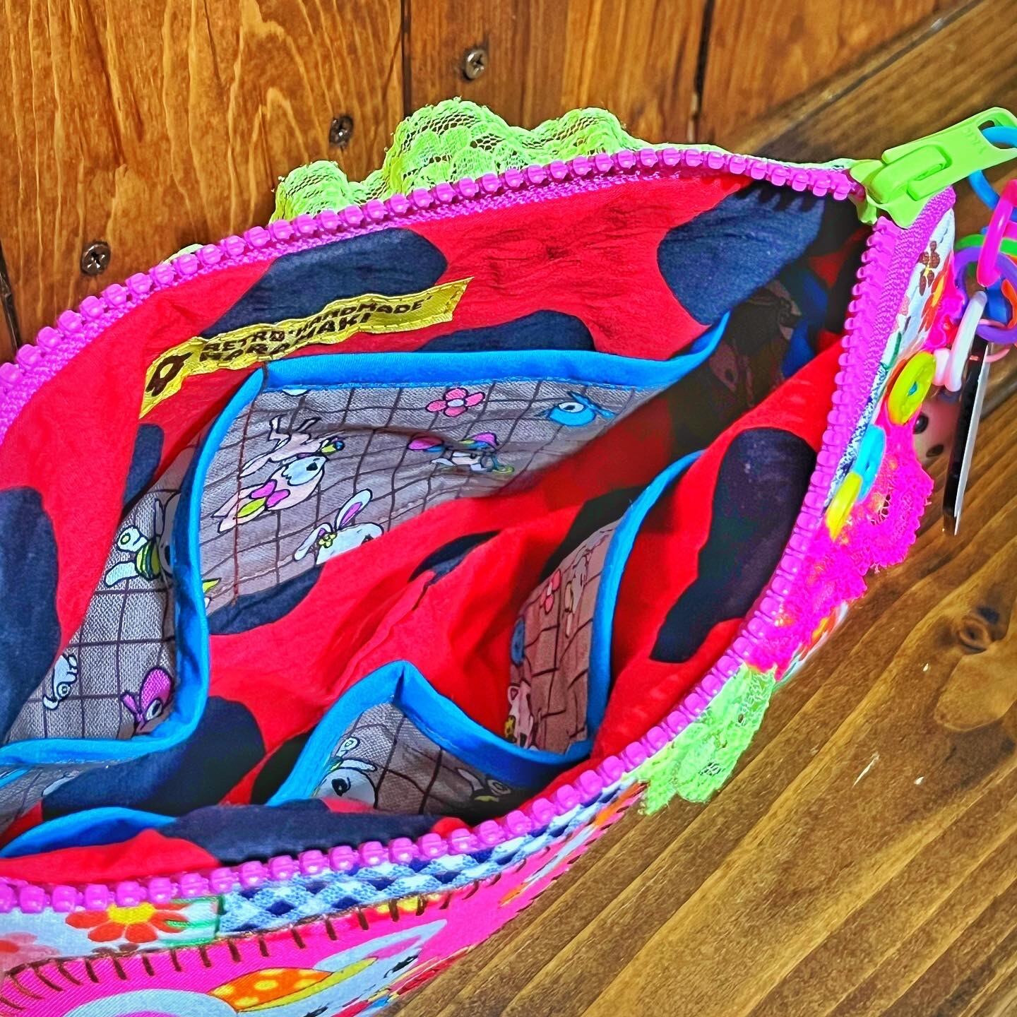 今回はイメージはアメリカン風にいちご入りのチェック&レトロ花柄を主体にレトロアニマルでは知らない人はいないのでは?と言われる位知られているハニーチューンの廃盤布をアップリケにしたレトロカラフルポーチとなっております〜。