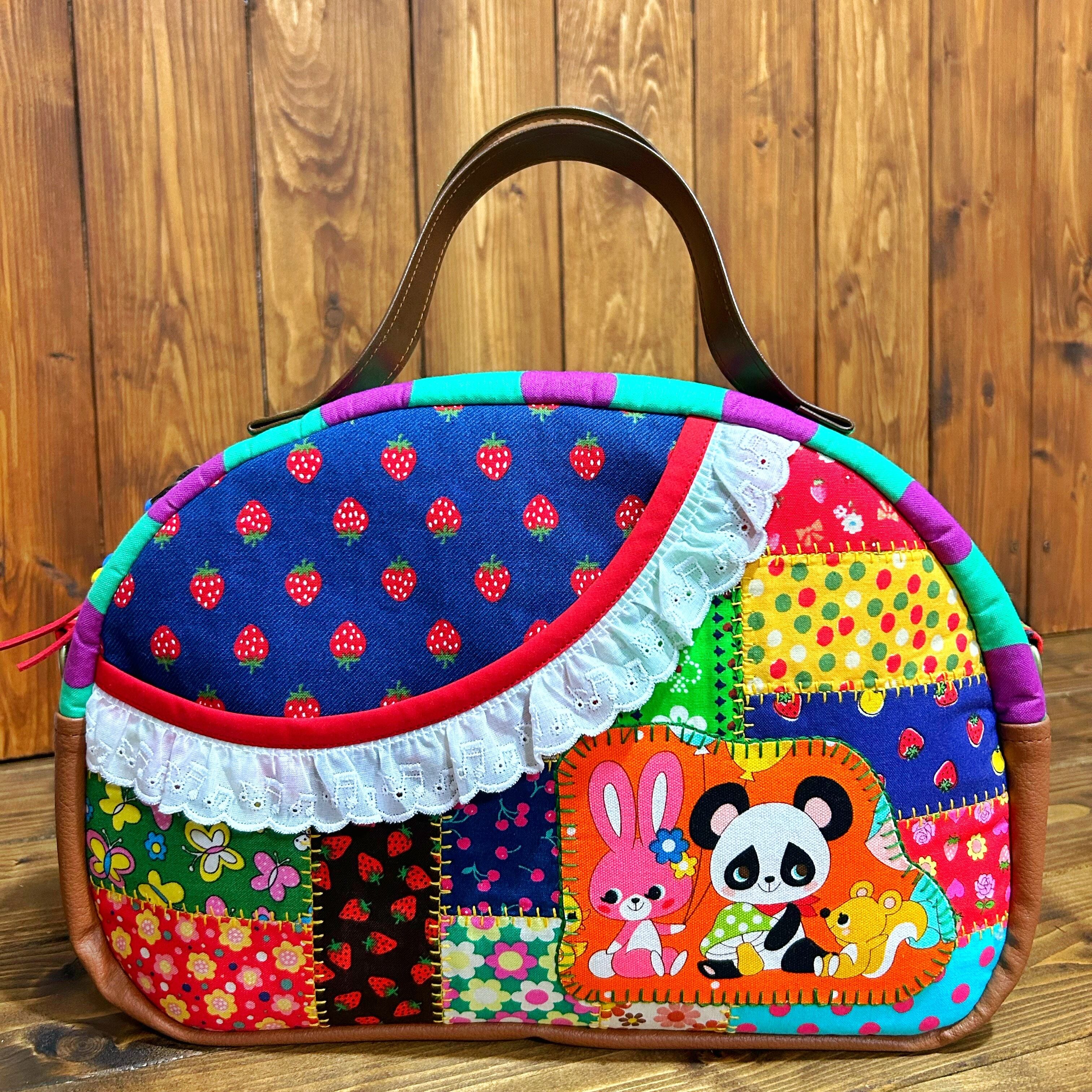 様々な廃盤布をパッチワークしたものにときめきフレンズの廃盤布からパンダちゃん&うさぎ&リスちゃんをアップリケにして仕上げた当店オリジナルのボストンバッグです〜♡