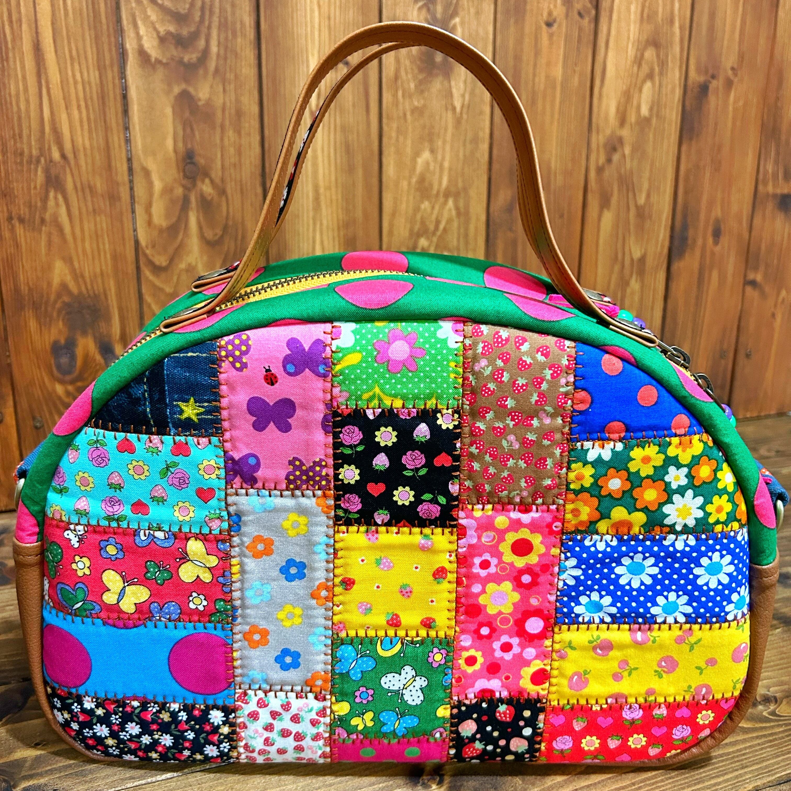 様々な廃盤布をパッチワークしたものにときめきフレンズの廃盤布からパンダちゃんをアップリケにして仕上げた当店オリジナルのボストンバッグです〜♡